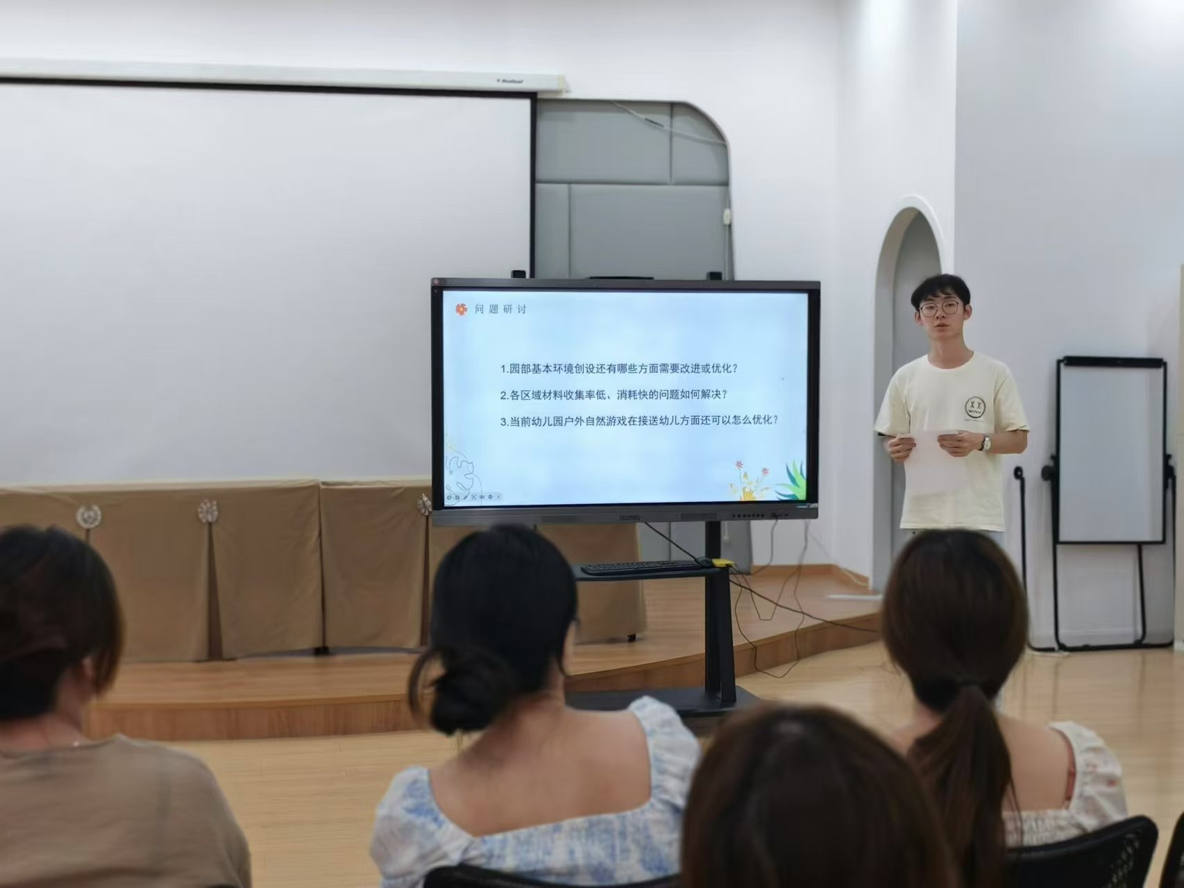 本次教研活动由王进园长主持,王园长根据园室内外自然游戏的现状及发展调查,请老师们就观察到的现状进行分享,并且希望能够给出相应的策略,落实到游戏中。