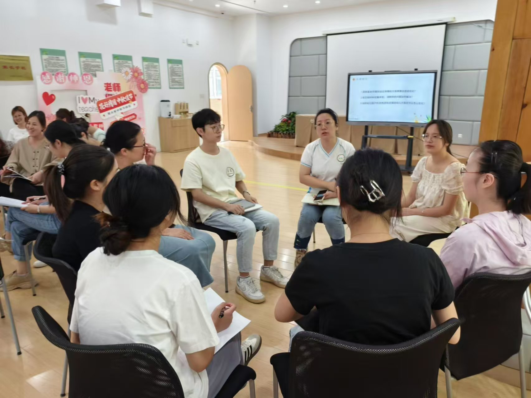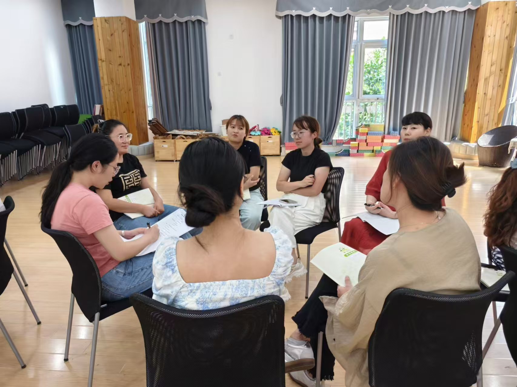 研讨活动中,老师们积极踊跃地发表自己的想法和意见,希望能投放丰富多样、易于幼儿操作的游戏材料。每个小组代表针对讨论的内容进行了分享交流!